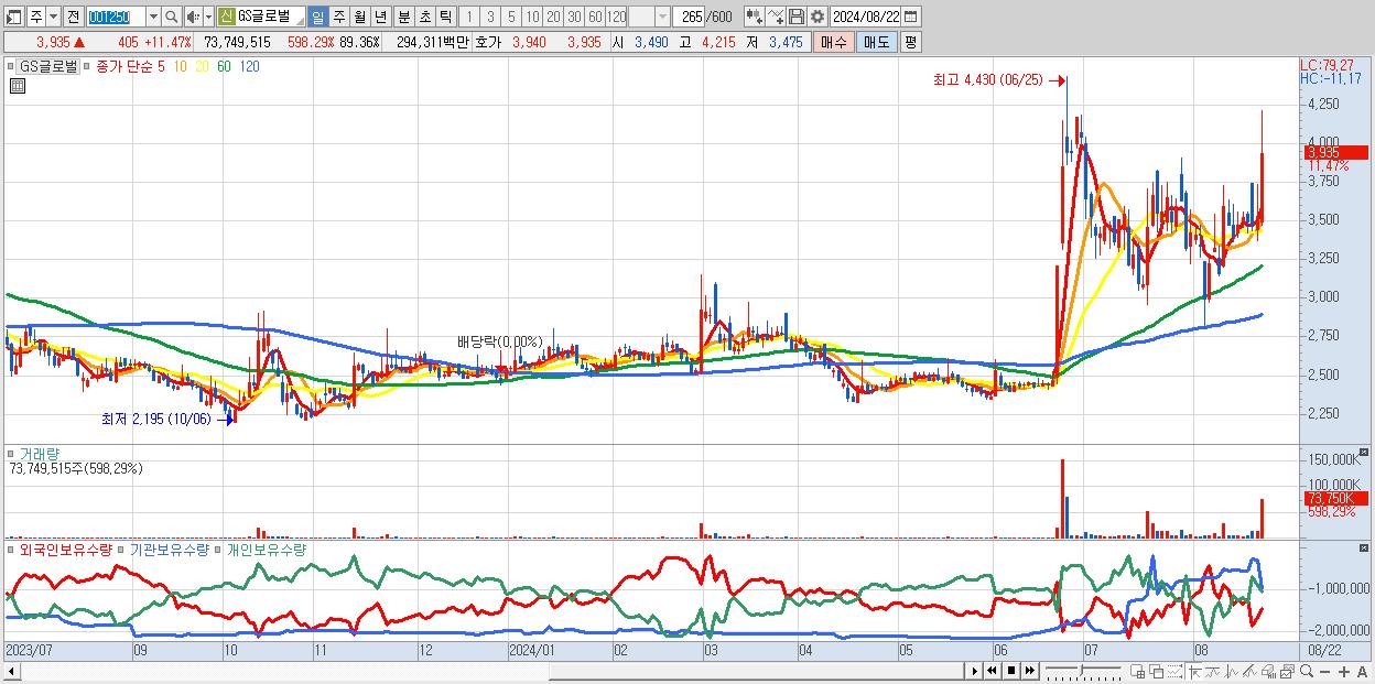 - GS글로벌 (3,935원 ▲ 11.47% , 시총: 3,248억, 거래량: 73,749,515, 거래대금:2,943억)