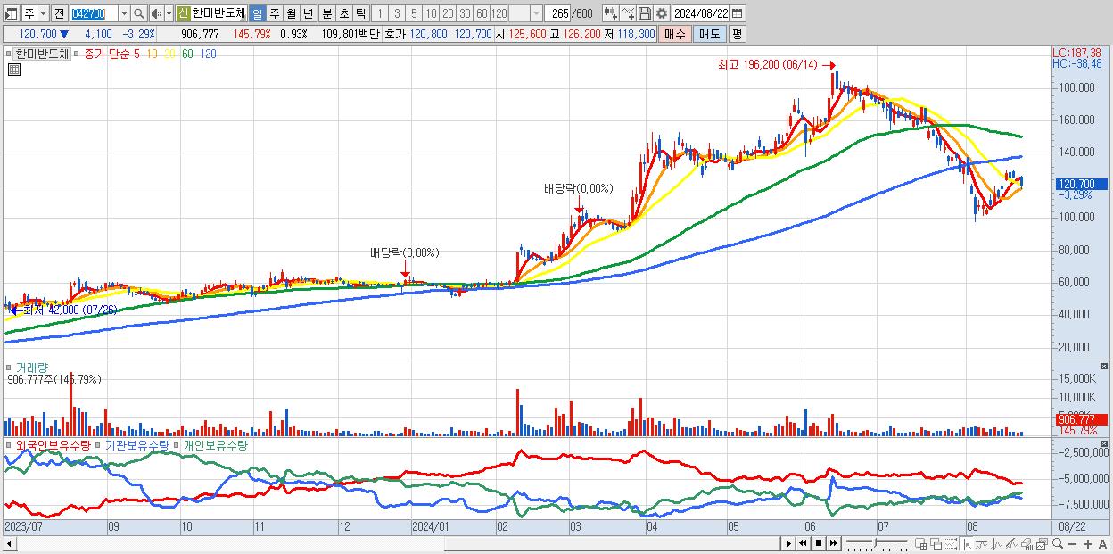 - 한미반도체 (120,700원 ▼ -3.29% , 시총: 117,071억, 거래량: 906,777, 거래대금:1,098억)
