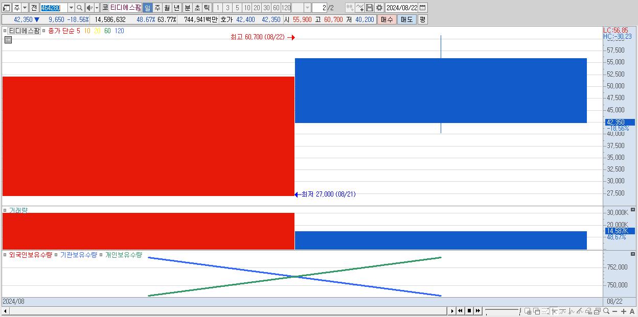 - 티디에스팜 (42,350원 ▼ -18.56% , 시총: 2,342억, 거래량: 14,586,632, 거래대금:7,449억)