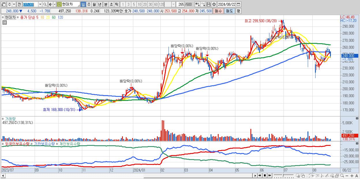 - 현대차 (248,000원 ▼ -1.78% , 시총: 519,352억, 거래량: 497,250, 거래대금:1,233억)