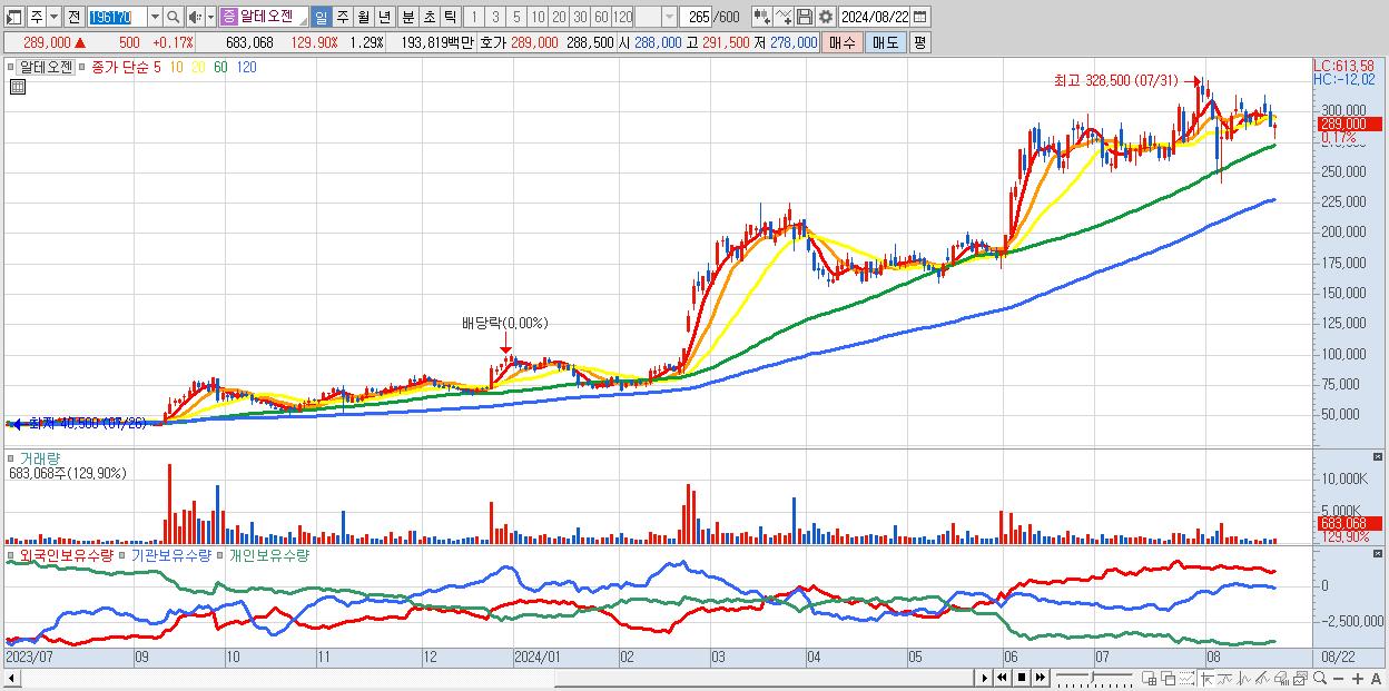 - 알테오젠 (289,000원 ▲ 0.17% , 시총: 153,599억, 거래량: 683,068, 거래대금:1,938억)