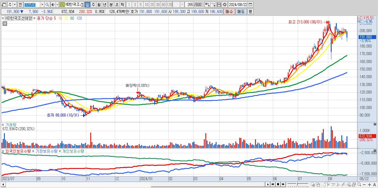 - HD한국조선해양 (191,800원 ▼ -3.96% , 시총: 135,743억, 거래량: 672,934, 거래대금:1,285억)