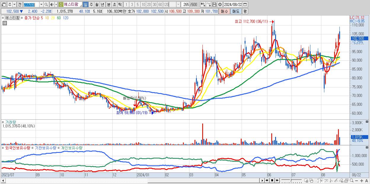 - 에스티팜 (102,500원 ▼ -2.29% , 시총: 20,174억, 거래량: 1,015,378, 거래대금:1,069억)