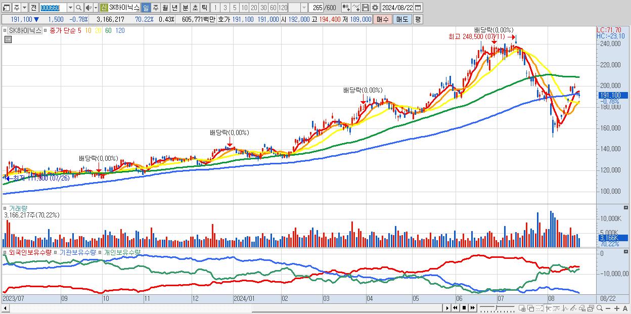 - SK하이닉스 (191,100원 ▼ -0.78% , 시총: 1,391,213억, 거래량: 3,166,217, 거래대금:6,058억)