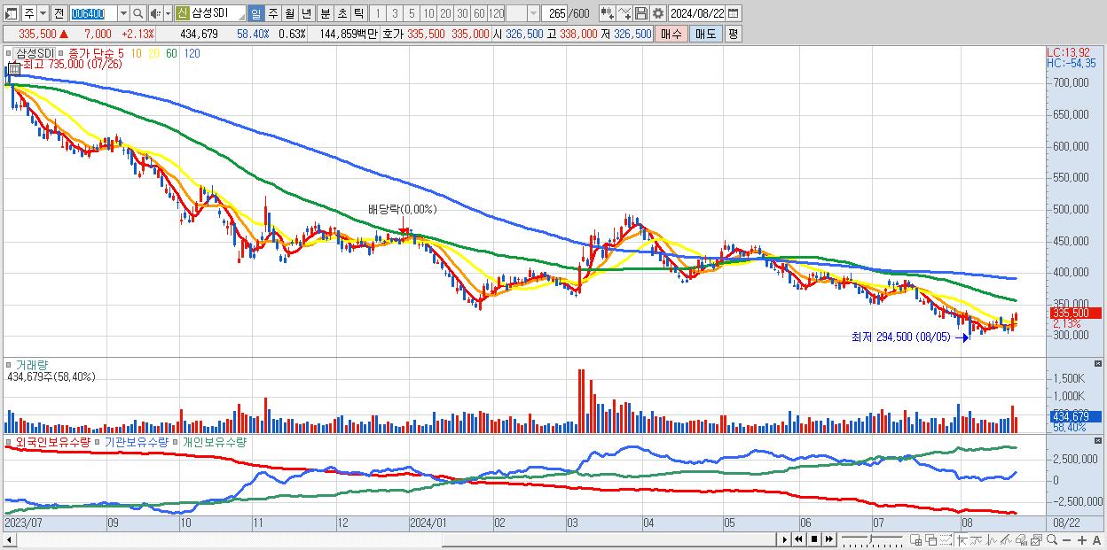 - 삼성SDI (335,500원 ▲ 2.13% , 시총: 230,705억, 거래량: 434,679, 거래대금:1,449억)