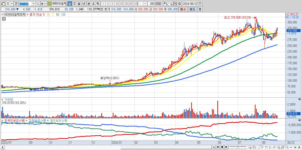 - HD현대일렉트릭 (314,500원 ▼ -1.41% , 시총: 113,368억, 거래량: 374,819, 거래대금:1,190억)