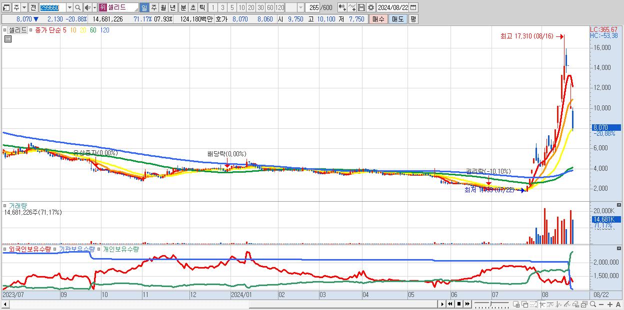 - 셀리드 (8,070원 ▼ -20.88% , 시총: 1,098억, 거래량: 14,681,226, 거래대금:1,242억)