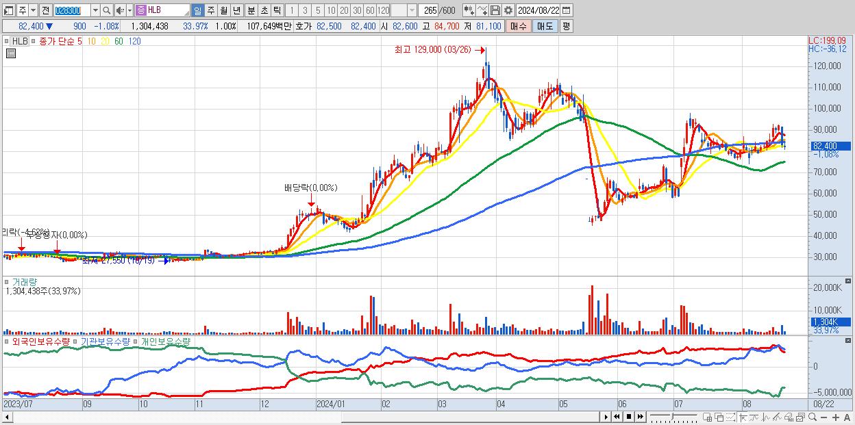 - HLB (82,400원 ▼ -1.08% , 시총: 107,817억, 거래량: 1,304,438, 거래대금:1,076억)