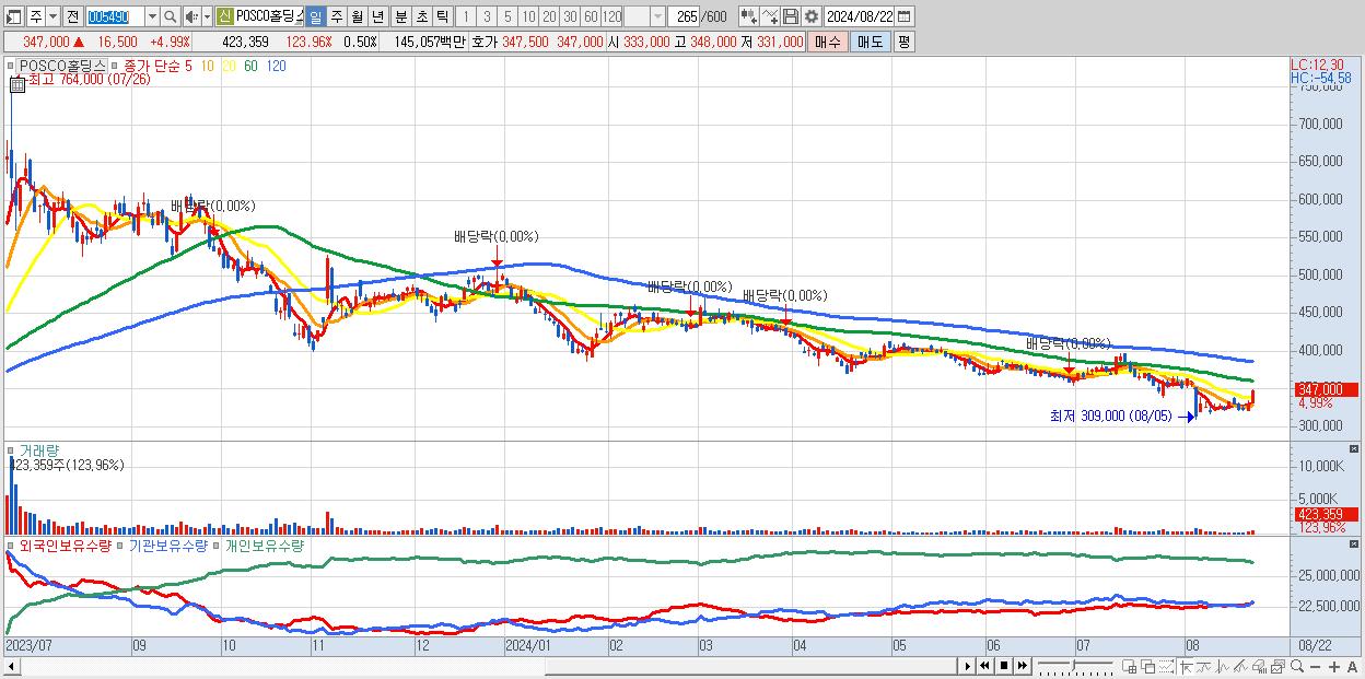 - POSCO홀딩스 (347,000원 ▲ 4.99% , 시총: 293,462억, 거래량: 423,359, 거래대금:1,451억)