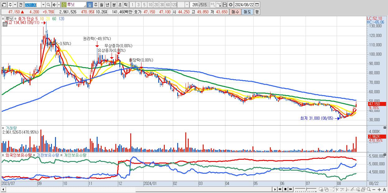 - 루닛 (47,150원 ▲ 9.78% , 시총: 13,614억, 거래량: 2,961,526, 거래대금:1,415억)