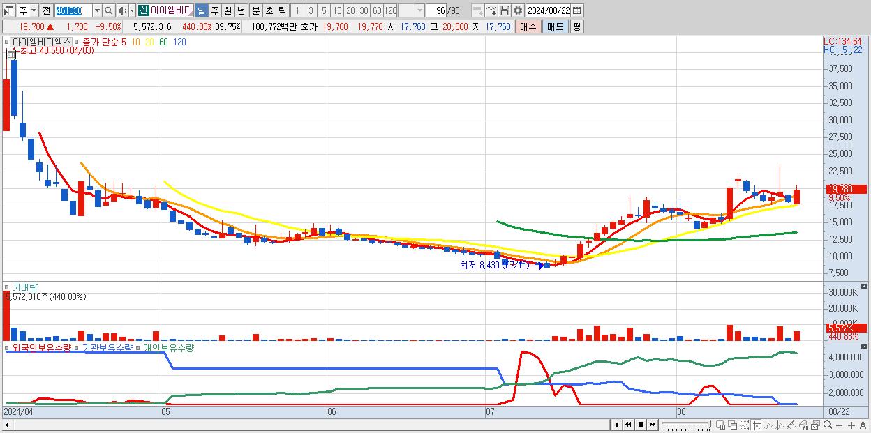 - 아이엠비디엑스 (19,780원 ▲ 9.58% , 시총: 2,773억, 거래량: 5,572,316, 거래대금:1,088억)