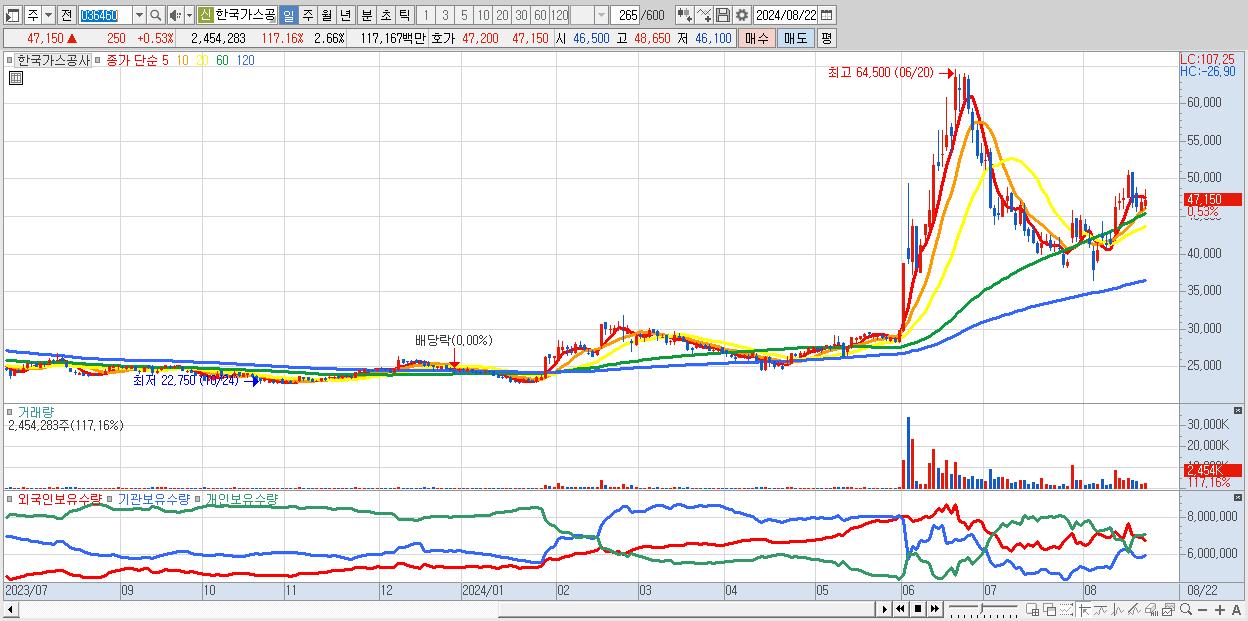 - 한국가스공사 (47,150원 ▲ 0.53% , 시총: 43,526억, 거래량: 2,454,283, 거래대금:1,172억)
