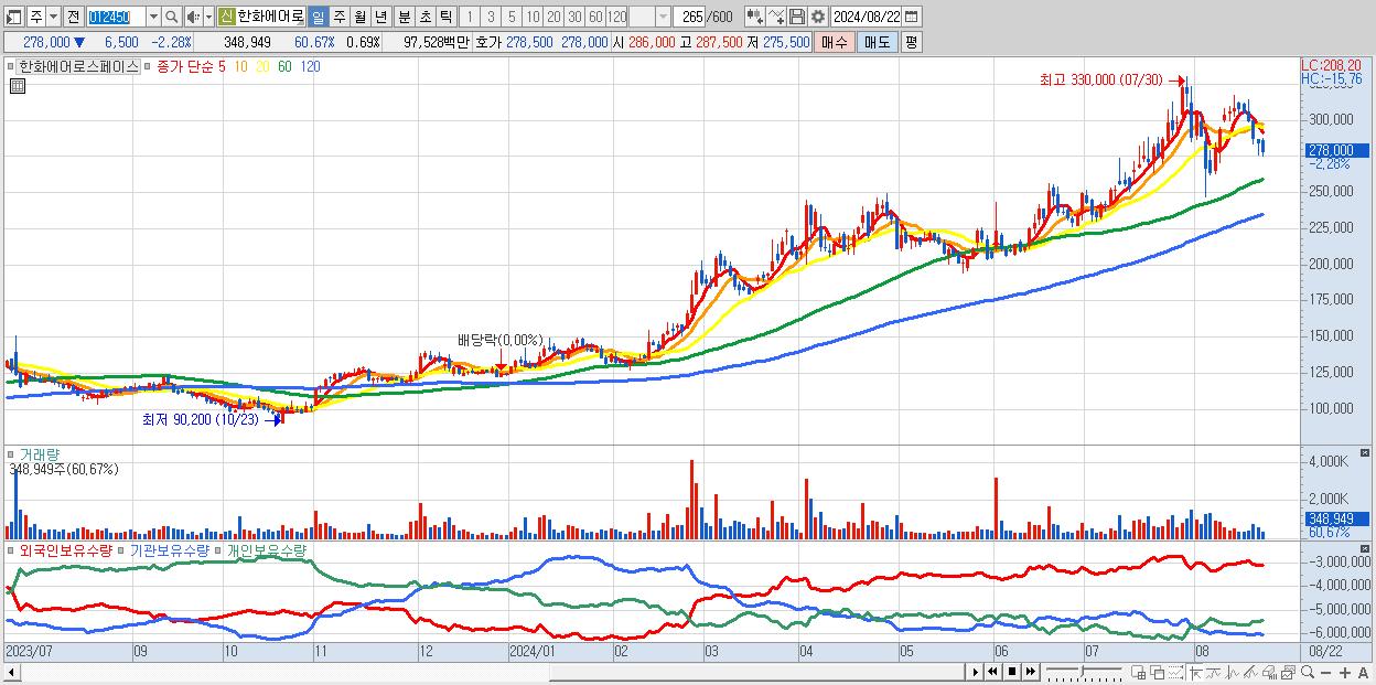 30.한화에어로스페이스 278,000원 ▼ -2.28% (KOSPI, 012450)