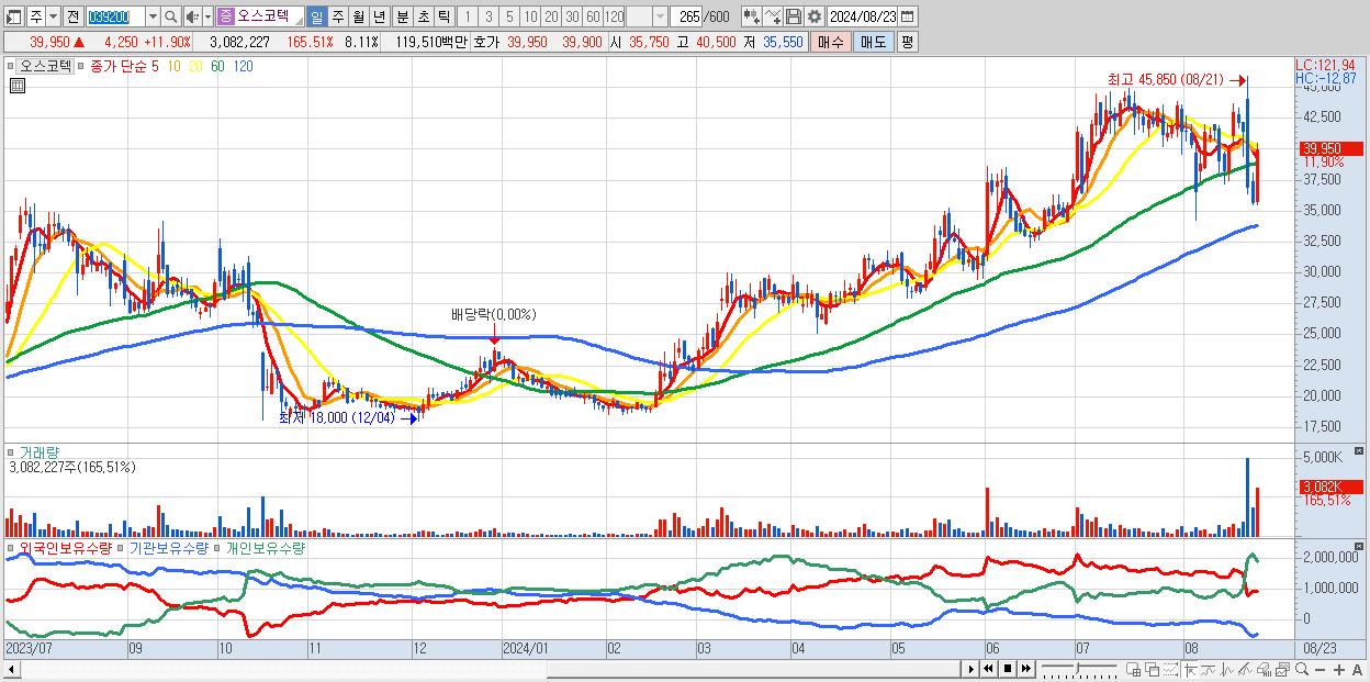 - 오스코텍 (39,950원 ▲ 11.9% , 시총: 15,179억, 거래량: 3,082,227, 거래대금:1,195억)