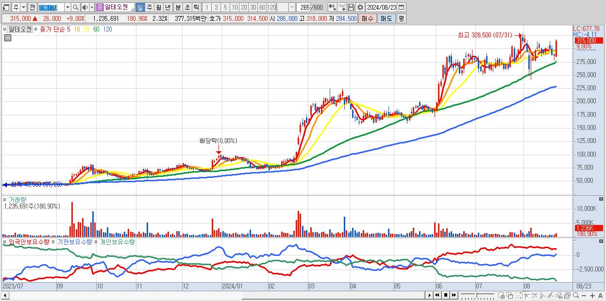 - 알테오젠 (315,000원 ▲ 9% , 시총: 167,418억, 거래량: 1,235,691, 거래대금:3,773억)