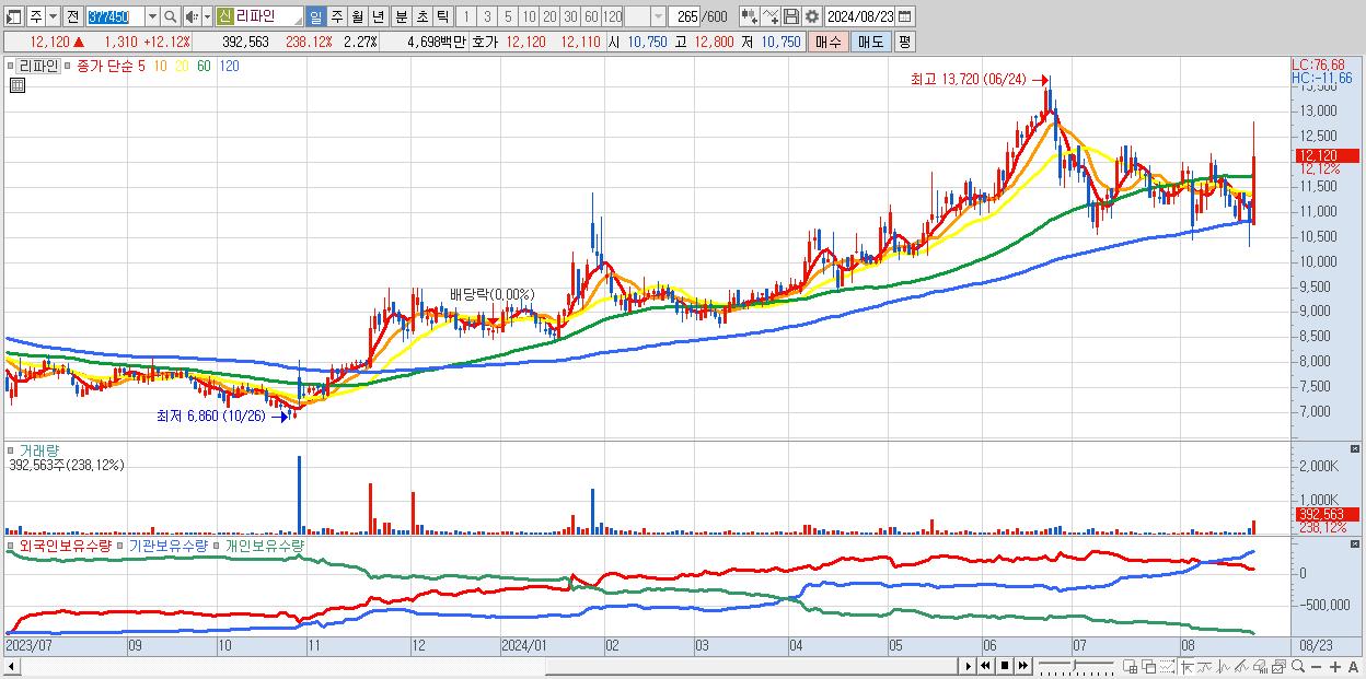 - 리파인 (12,120원 ▲ 12.12% , 시총: 2,100억, 거래량: 392,563, 거래대금:47억)