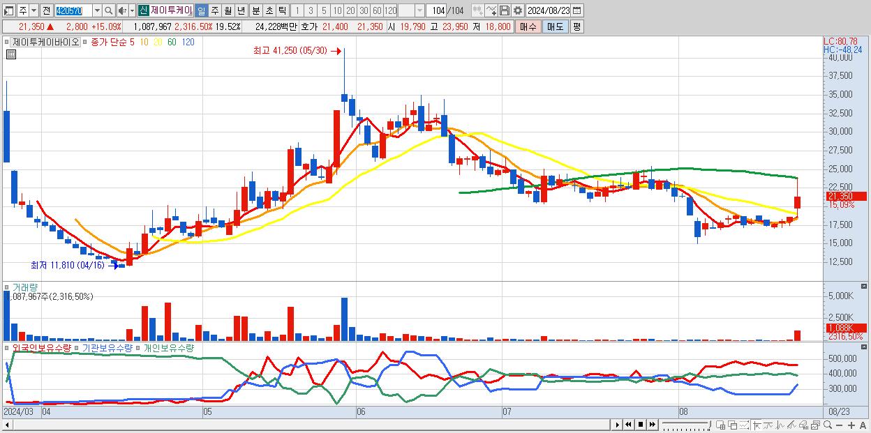 - 제이투케이바이오 (21,350원 ▲ 15.09% , 시총: 1,190억, 거래량: 1,087,967, 거래대금:242억)