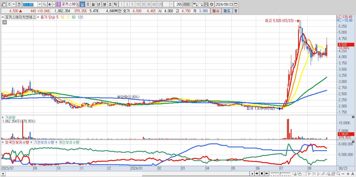 - 포커스에이치엔에스 (4,500원 ▲ 10.84% , 시총: 874억, 거래량: 1,062,354, 거래대금:48억)