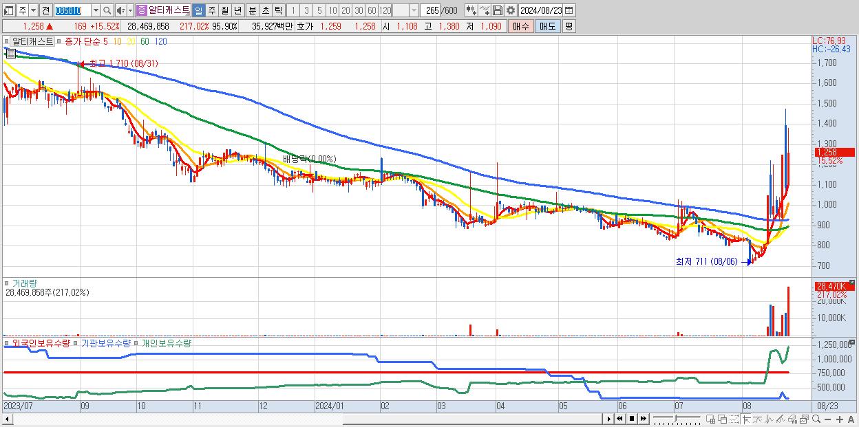 - 알티캐스트 (1,258원 ▲ 15.52% , 시총: 373억, 거래량: 28,469,858, 거래대금:359억)