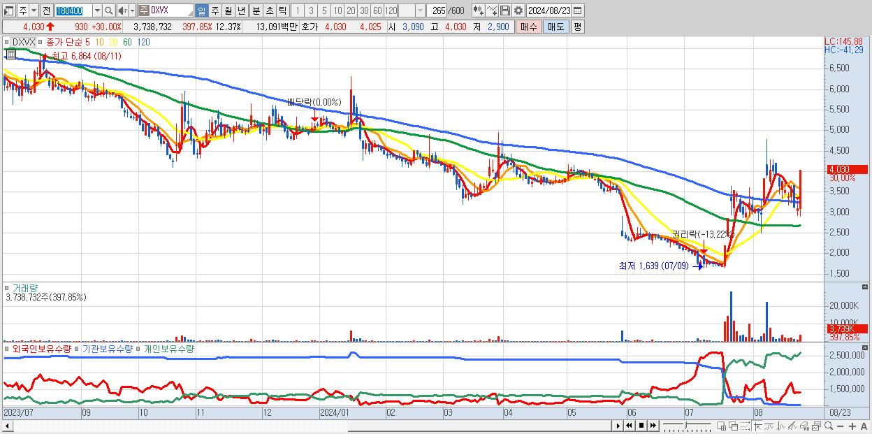 - DXVX (4,030원 ▲ 30% , 시총: 1,218억, 거래량: 3,738,732, 거래대금:131억)