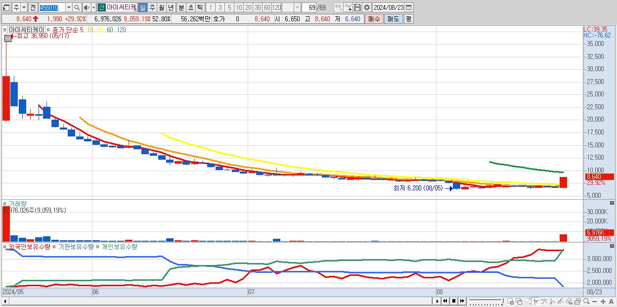 - 아이씨티케이 (8,640원 ▲ 29.92% , 시총: 1,142억, 거래량: 6,976,026, 거래대금:563억)