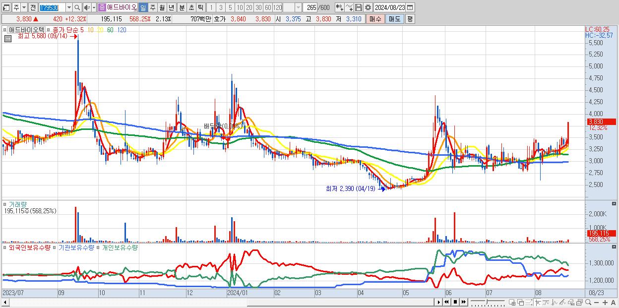 - 애드바이오텍 (3,830원 ▲ 12.32% , 시총: 350억, 거래량: 195,115, 거래대금:7억)
