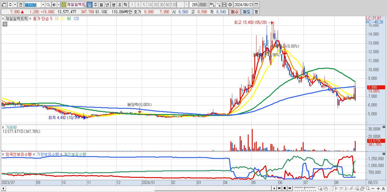 - 제일일렉트릭 (7,990원 ▲ 19.08% , 시총: 1,775억, 거래량: 13,577,477, 거래대금:1,101억)