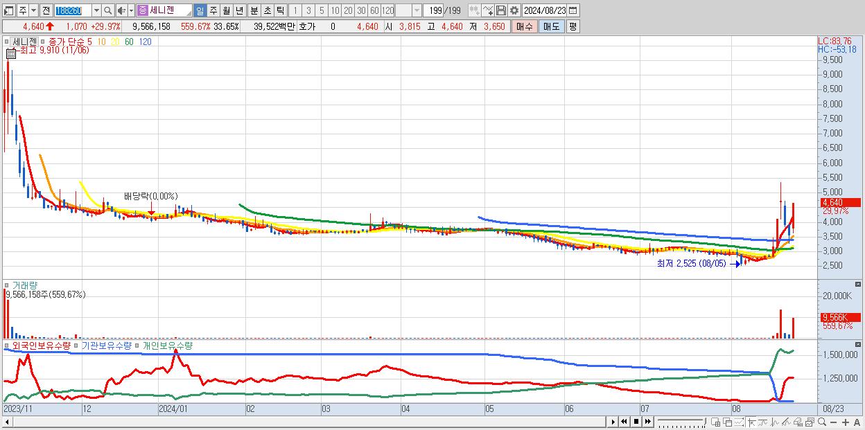 - 세니젠 (4,640원 ▲ 29.97% , 시총: 332억, 거래량: 9,566,158, 거래대금:395억)