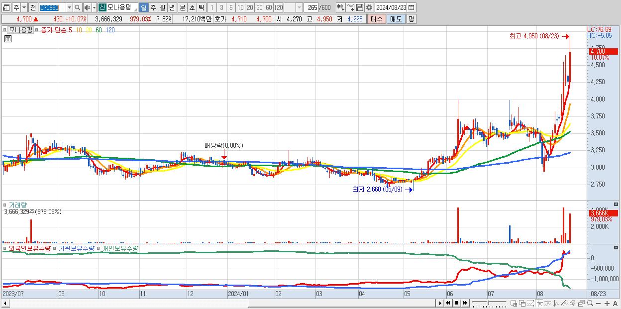 - 모나용평 (4,700원 ▲ 10.07% , 시총: 2,262억, 거래량: 3,666,329, 거래대금:172억)
