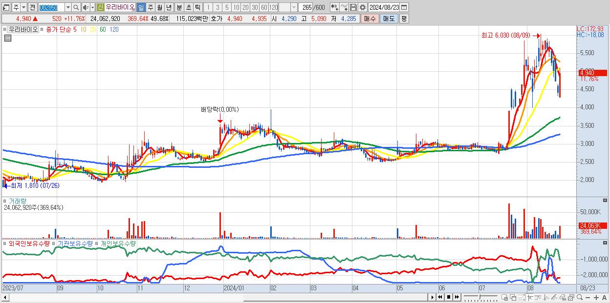 - 우리바이오 (4,940원 ▲ 11.76% , 시총: 2,393억, 거래량: 24,062,920, 거래대금:1,150억)