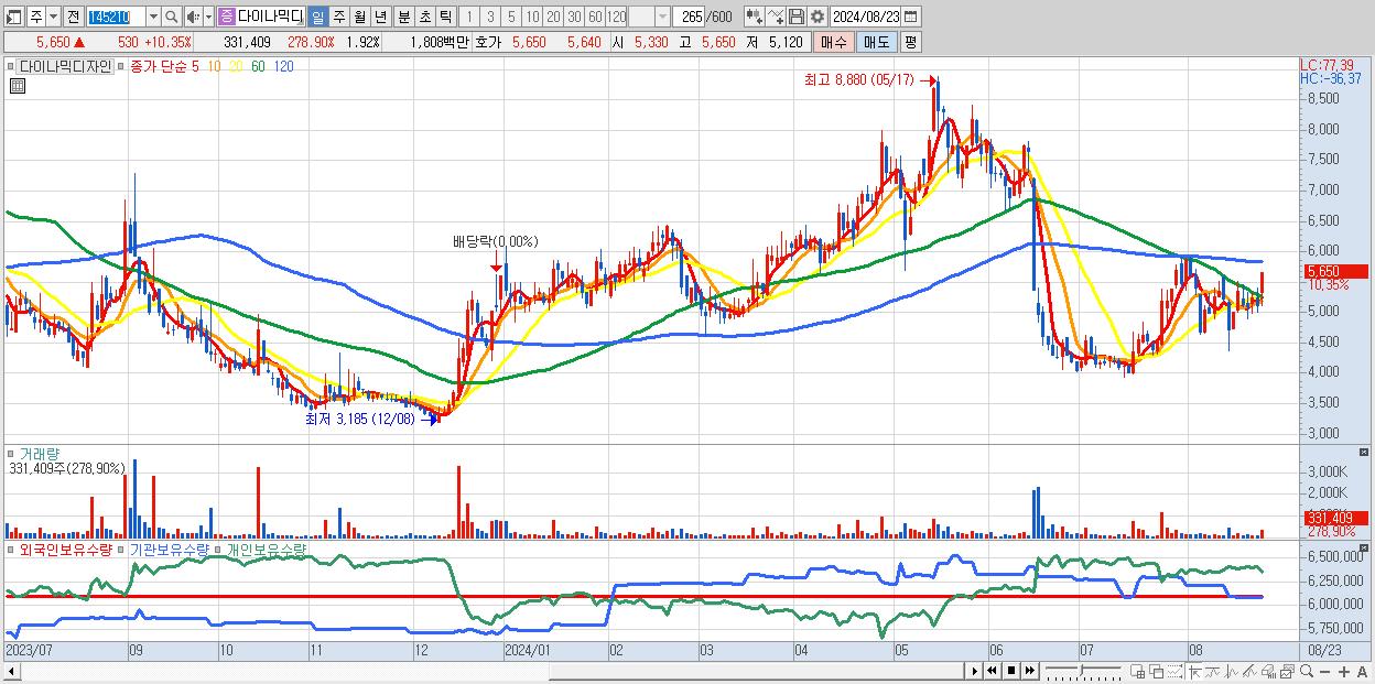 - 다이나믹디자인 (5,650원 ▲ 10.35% , 시총: 978억, 거래량: 331,409, 거래대금:18억)