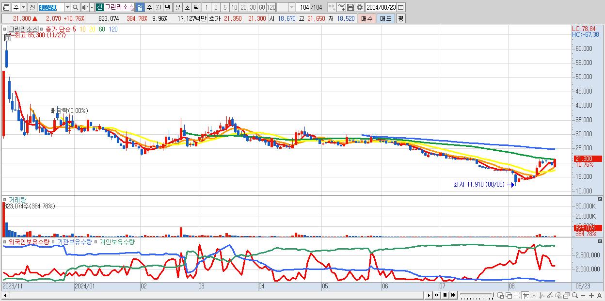 - 그린리소스 (21,300원 ▲ 10.76% , 시총: 1,761억, 거래량: 823,074, 거래대금:171억)