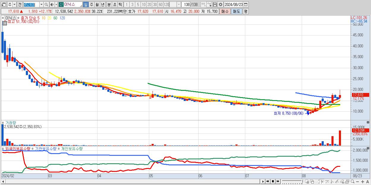 - 이닉스 (17,610원 ▲ 12.17% , 시총: 1,597억, 거래량: 12,538,542, 거래대금:2,312억)