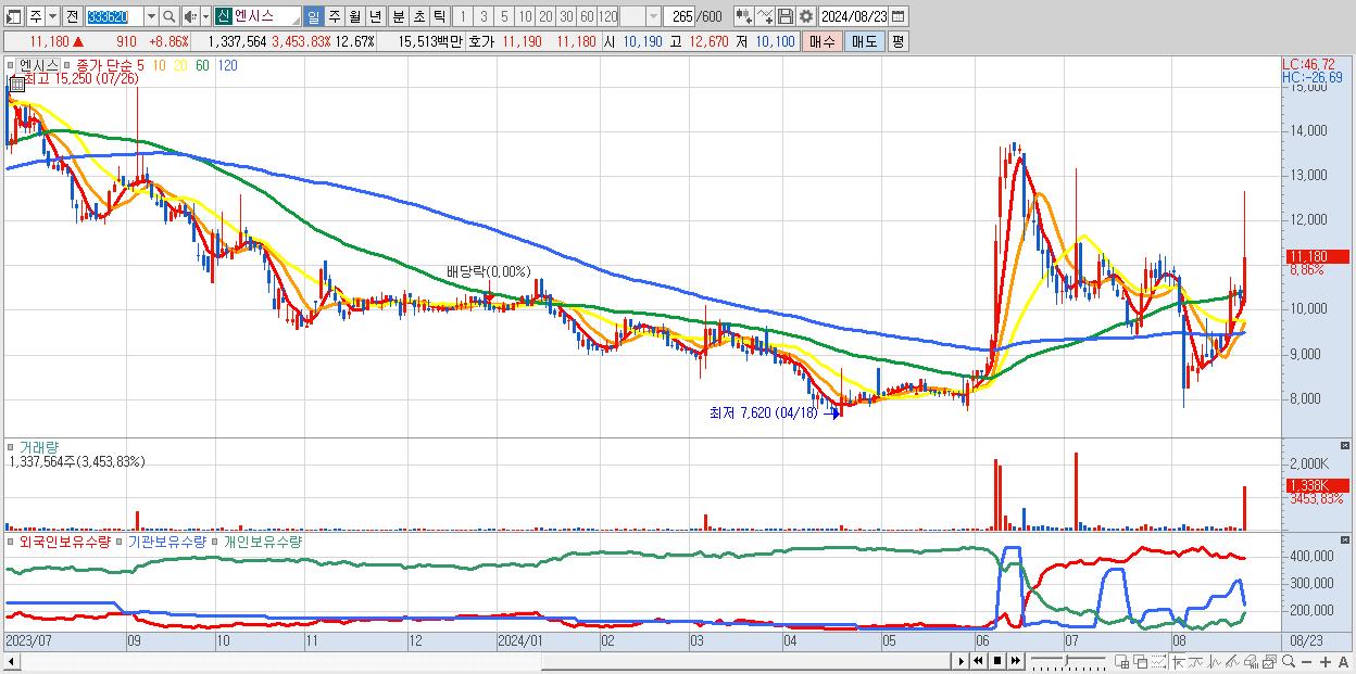 30.엔시스 11,180원 ▲ 8.86% (KOSDAQ, 333620)