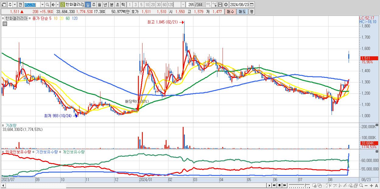 - 한화갤러리아 (1,511원 ▲ 15.96% , 시총: 2,929억, 거래량: 33,684,330, 거래대금:510억)