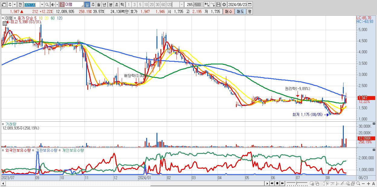 - 이렘 (1,947원 ▲ 12.22% , 시총: 595억, 거래량: 12,089,935, 거래대금:241억)
