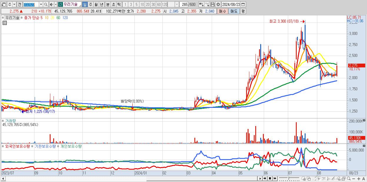 - 우리기술 (2,275원 ▲ 10.17% , 시총: 3,614억, 거래량: 45,129,765, 거래대금:1,023억)
