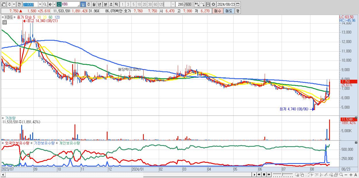 - KBG (7,750원 ▲ 25.61% , 시총: 677억, 거래량: 11,533,591, 거래대금:861억)