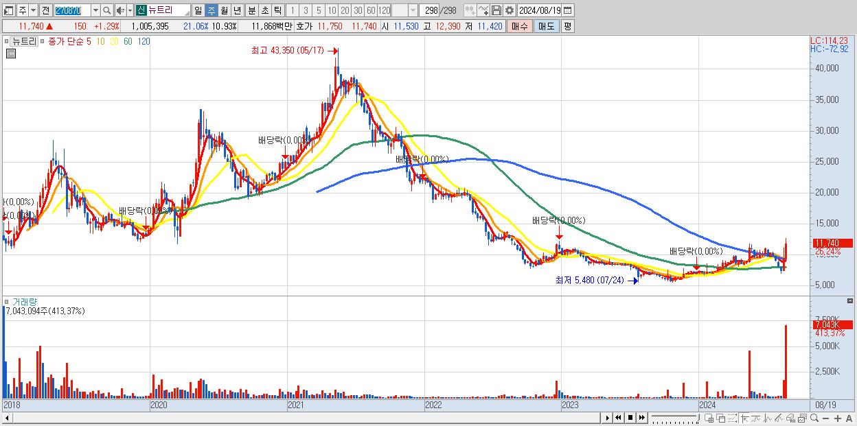 - 뉴트리 (11,740원 ▲ 26.24% , 시총: 1,080억, 거래량: 7,043,094, 거래대금:805억)