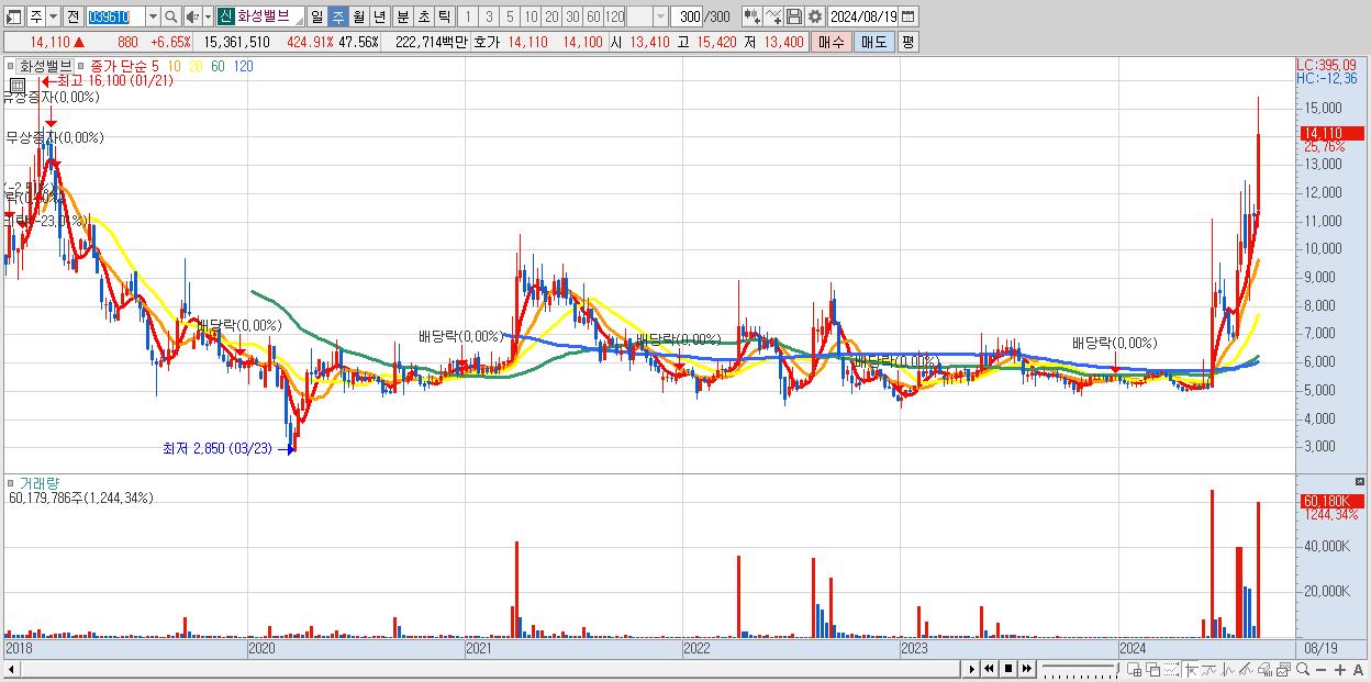 - 화성밸브 (14,110원 ▲ 25.76% , 시총: 1,469억, 거래량: 60,179,786, 거래대금:8,236억)