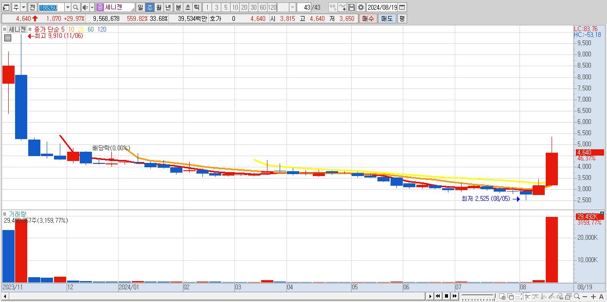 - 세니젠 (4,640원 ▲ 46.37% , 시총: 332억, 거래량: 29,492,357, 거래대금:1,303억)