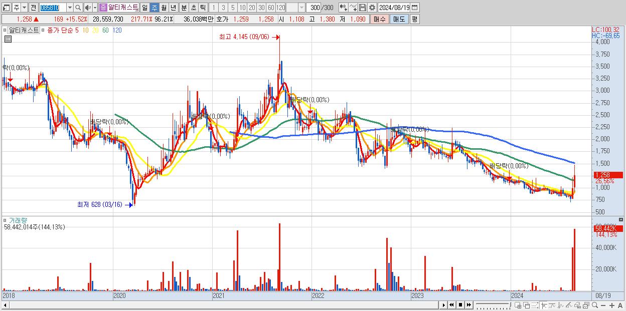 - 알티캐스트 (1,258원 ▲ 26.56% , 시총: 373억, 거래량: 58,442,014, 거래대금:712억)