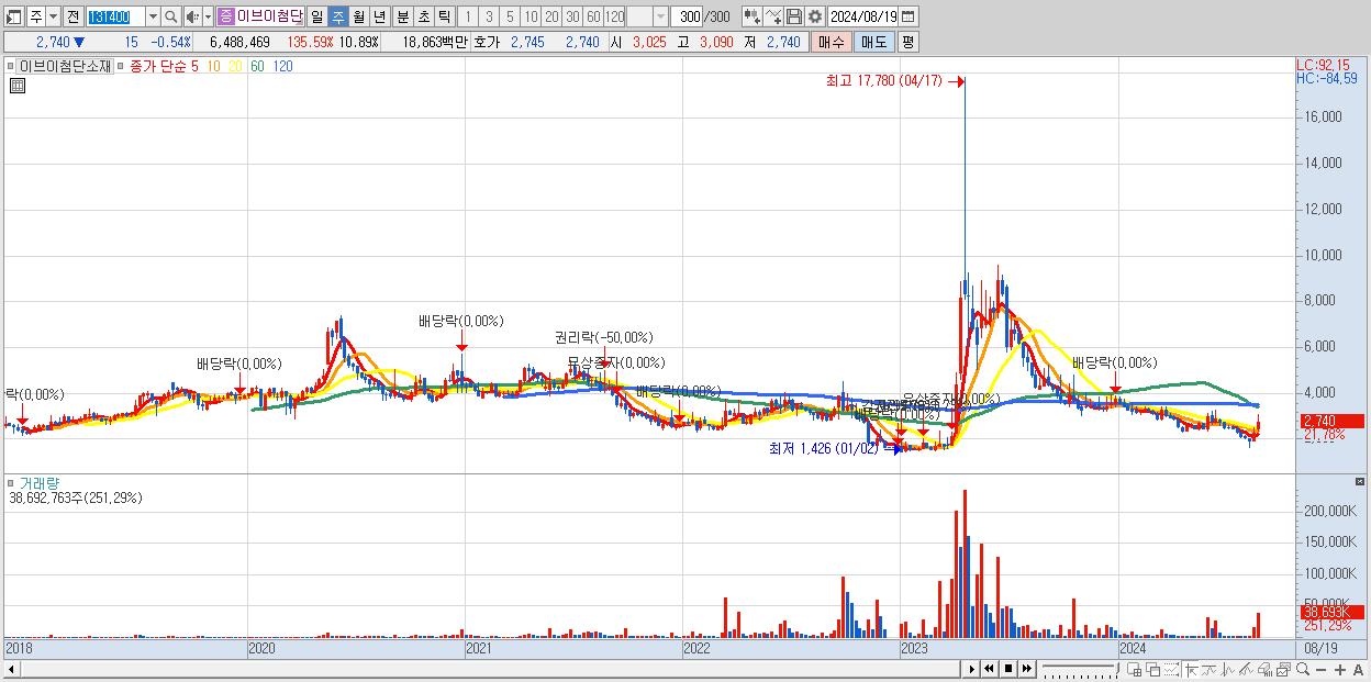 - 이브이첨단소재 (2,740원 ▲ 21.78% , 시총: 1,633억, 거래량: 38,692,763, 거래대금:1,065억)