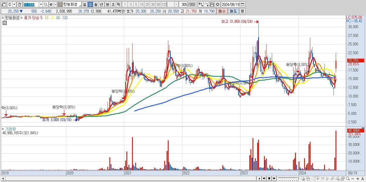 - 한농화성 (20,250원 ▲ 28.65% , 시총: 3,167억, 거래량: 46,986,165, 거래대금:9,415억)