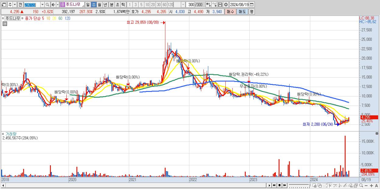 - 푸드나무 (4,295원 ▲ 25.4% , 시총: 576억, 거래량: 2,456,567, 거래대금:99억)