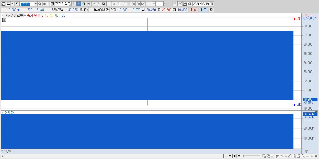 - 전진건설로봇 (19,980원 ▲ 21.09% , 시총: 3,069억, 거래량: 34,240,034, 거래대금:7,999억)