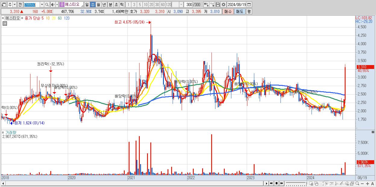 - 에스티오 (3,310원 ▲ 40.55% , 시총: 414억, 거래량: 2,907,247, 거래대금:87억)