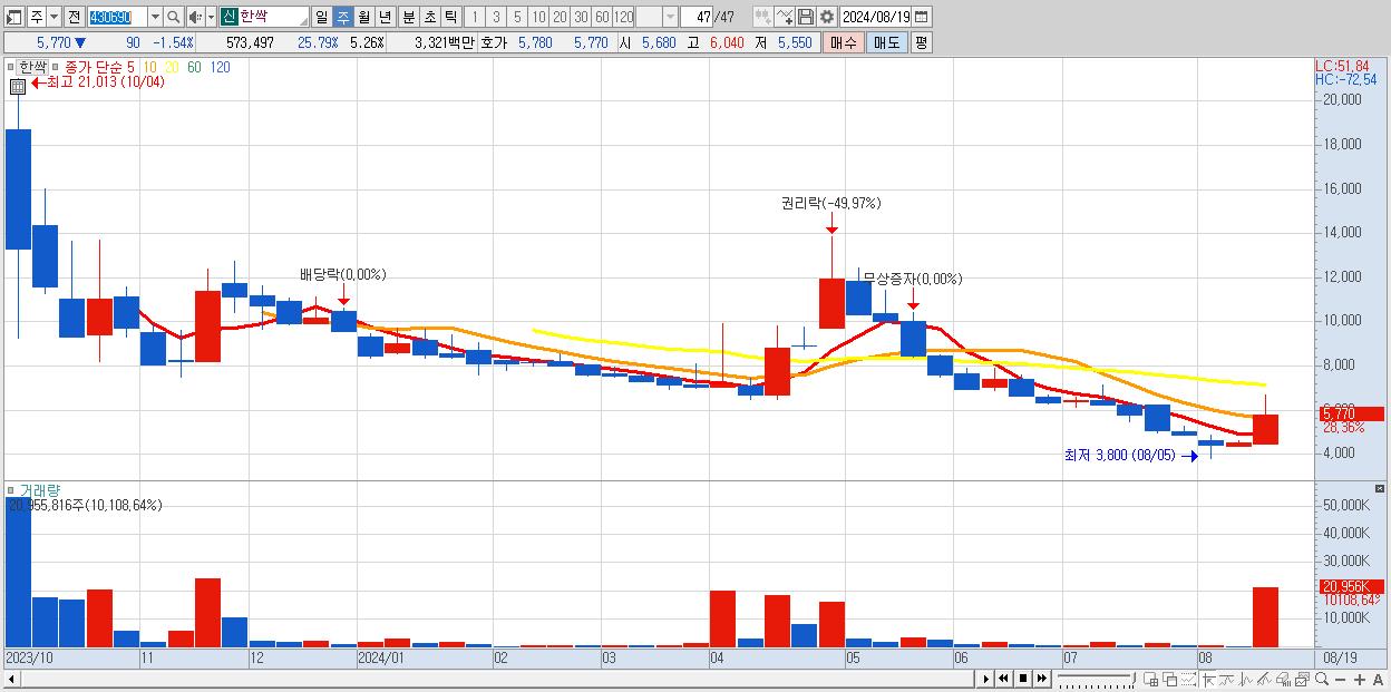 - 한싹 (5,770원 ▲ 28.36% , 시총: 629억, 거래량: 20,955,816, 거래대금:1,244억)
