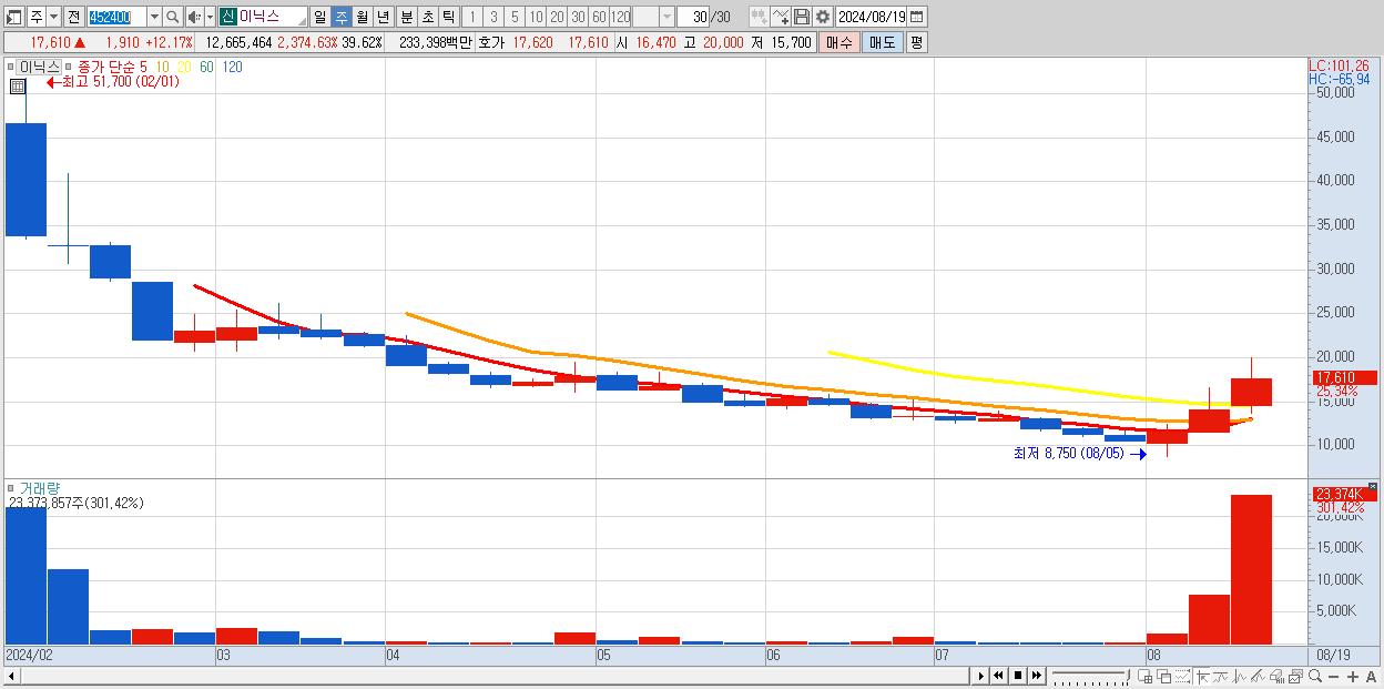 - 이닉스 (17,610원 ▲ 25.34% , 시총: 1,597억, 거래량: 23,373,857, 거래대금:4,164억)