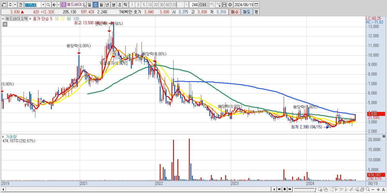 - 애드바이오텍 (3,830원 ▲ 21.59% , 시총: 350억, 거래량: 474,187, 거래대금:17억)